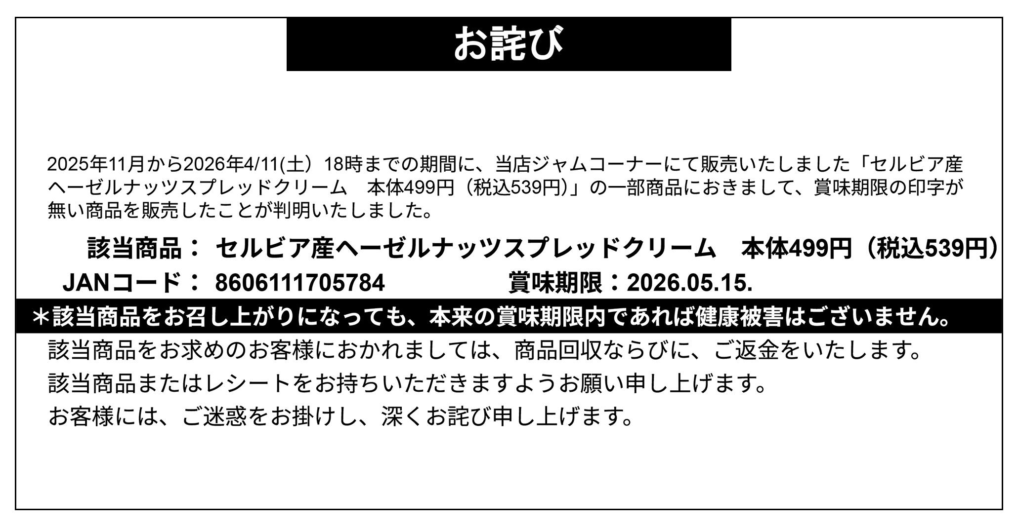 - 【お詫び】セルビア産ヘーゼルナッツスプレッドクリーム 商品回収 (1枚)