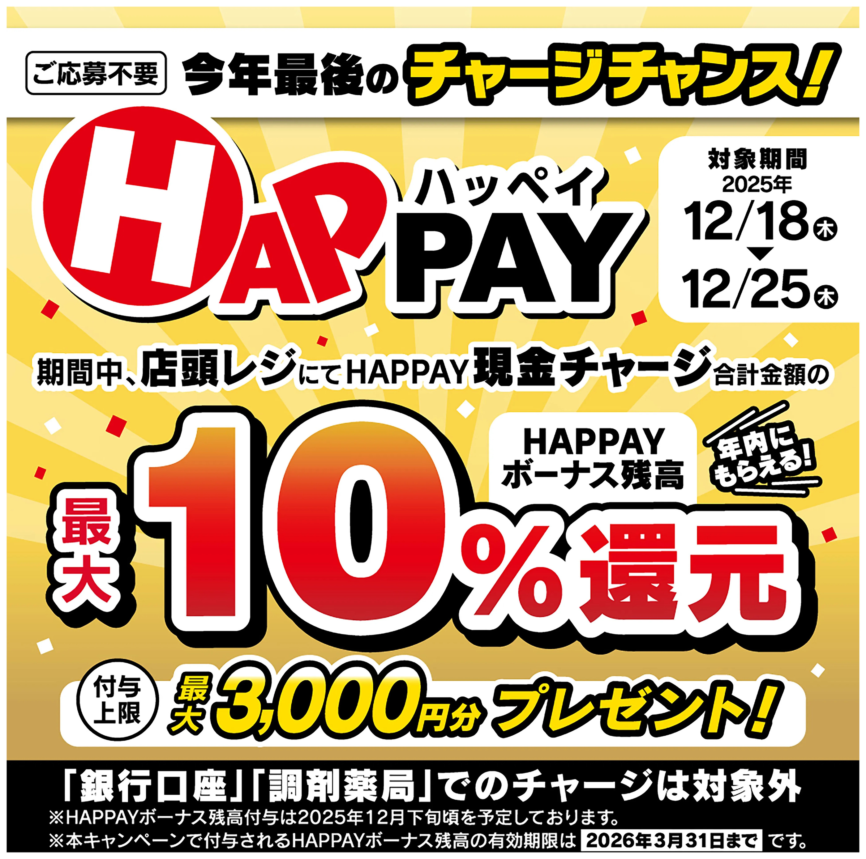 - 今年最後のチャージチャンス!HAPPAY現金チャージで、HAPPAYボーナス残高最大10%還元!12月18日~12月25日new (1枚)