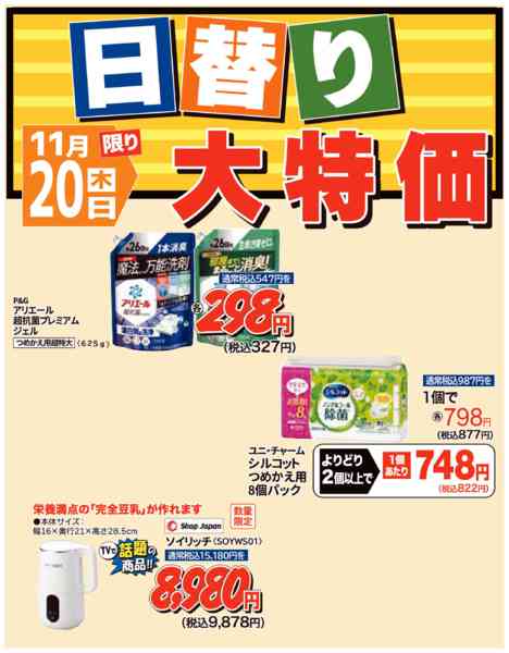 ※「店舗の掲載内容について」チラシガイドに掲載している情報は、独自に調査した内容及びユーザーから頂いた情報を掲載しています。お気づきの点がございましたら「お問い合わせ」よりご連絡ください。また店舗の営業状況、商品に関するお問い合わせは直接店舗事業者にご確認ください。