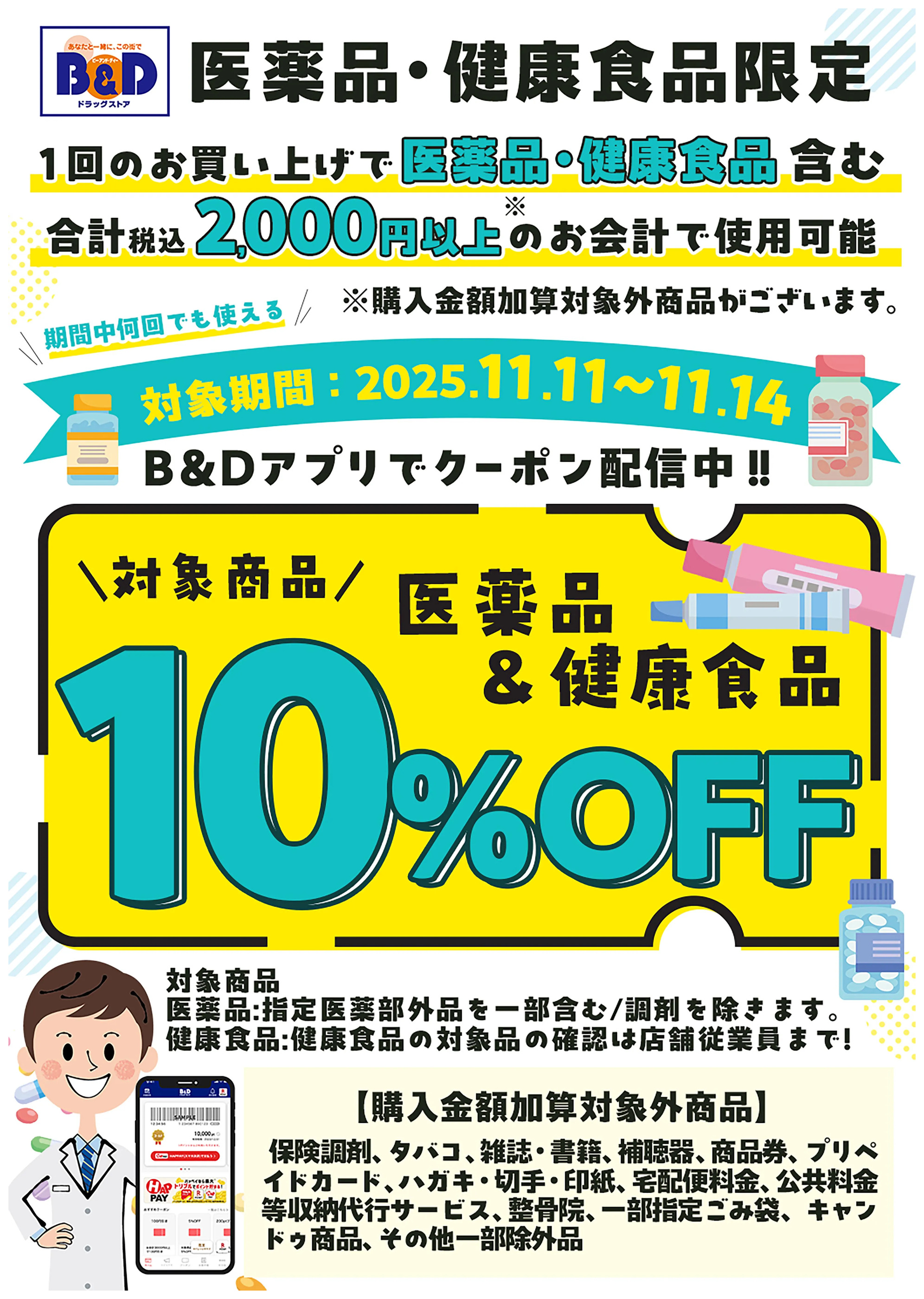 - 対象の医薬品・健康食品10%OFFクーポン!B&Dアプリで配信中!11月11日~11月14日new (1枚)