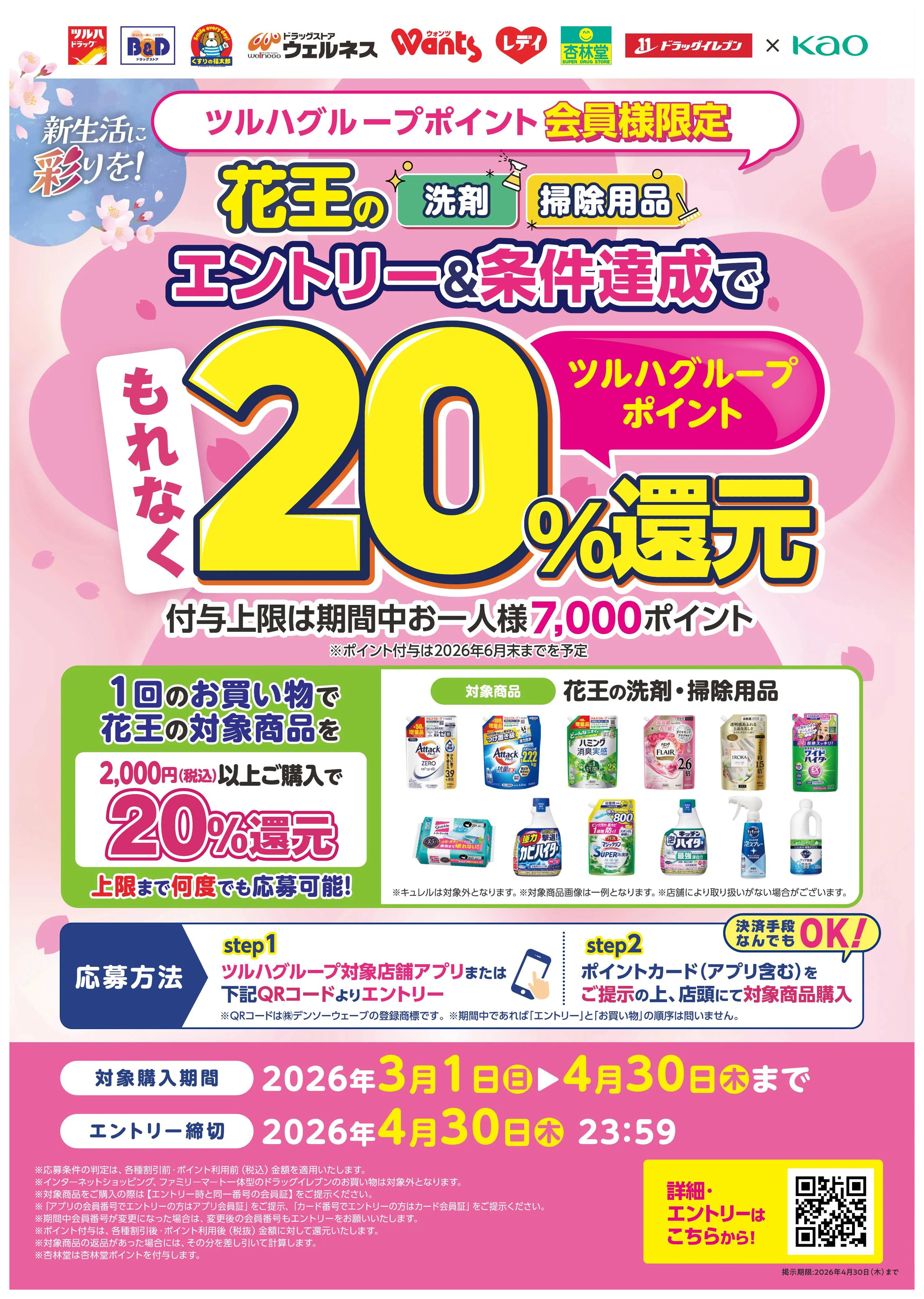 - 2026.3.1-2026.4.30【花王】新生活応援(洗剤・掃除用品対象) 最大20%還元CP3月1日~4月30日new (1枚)