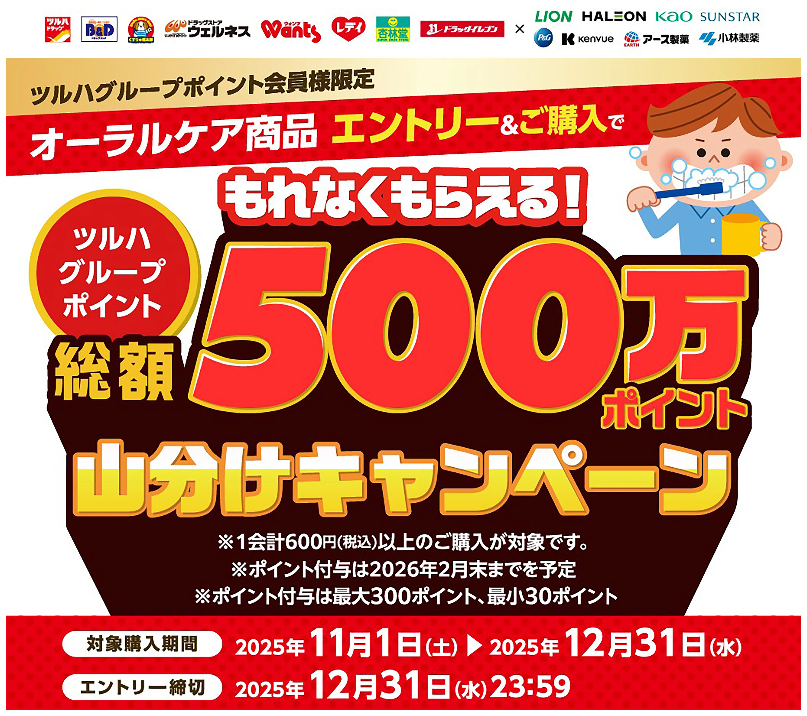 - ツルハグループポイント総額500万ポイント山分けキャンペーン!オーラルケア商品を購入・エントリー!11月1日~12月31日new (1枚)