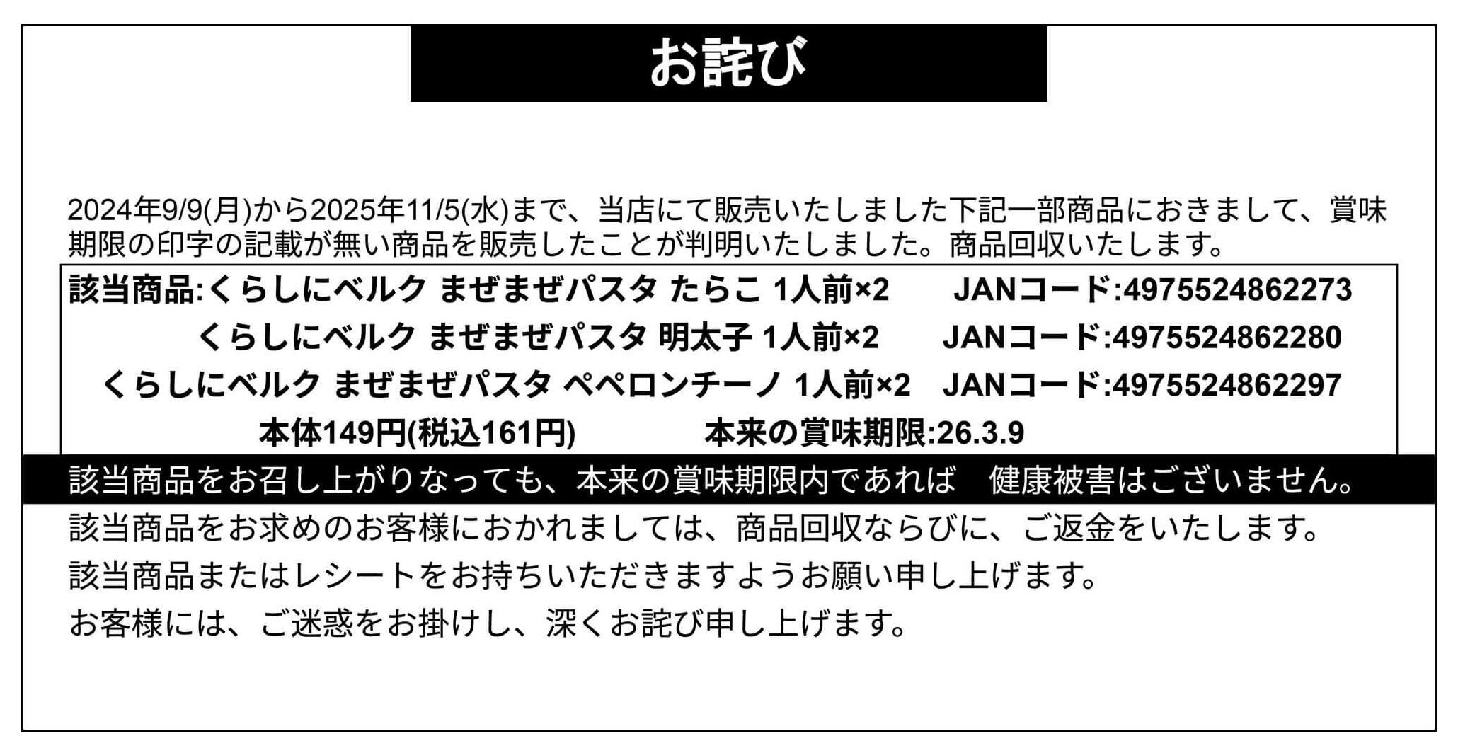 - 【お詫び】くらしにベルク まぜまぜパスタ たらこ・明太子・ペペロンチーノ 1人前×2 商品回収new (1枚)