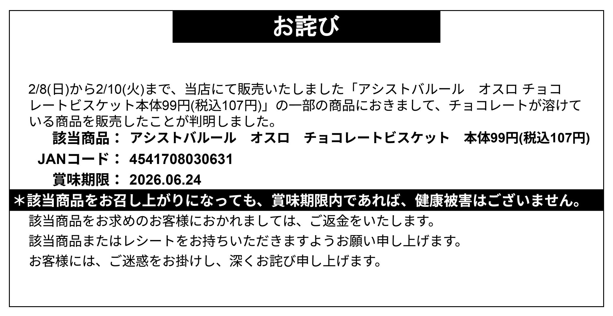 - 【お詫び】アシストバルール オスロ チョコレートビスケット 返金対応 (1枚)