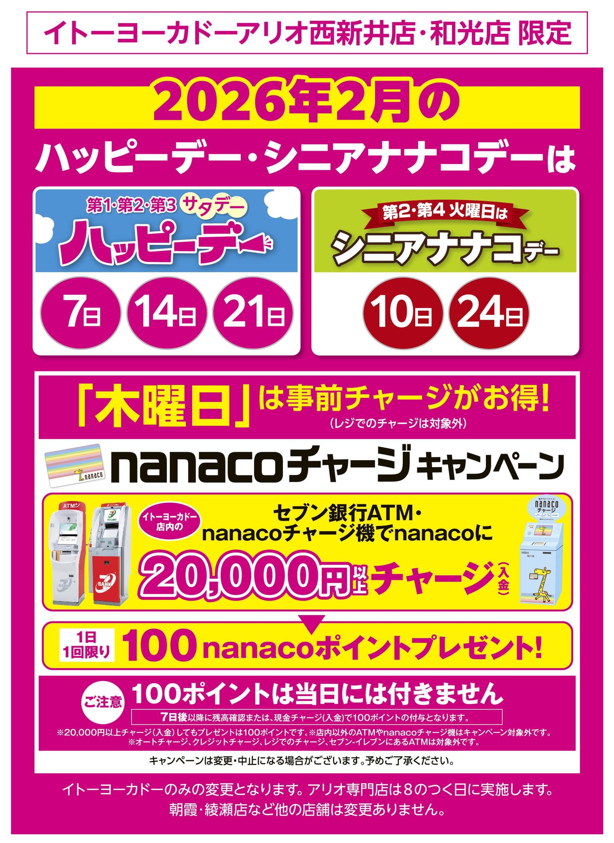 - 2/1(日)~2/28(土) 見逃し注意!!2月お買得Day /2026年2月のハッピーデー・シニアナナコデー・木曜日はnanacoチャージがお得! (2枚)