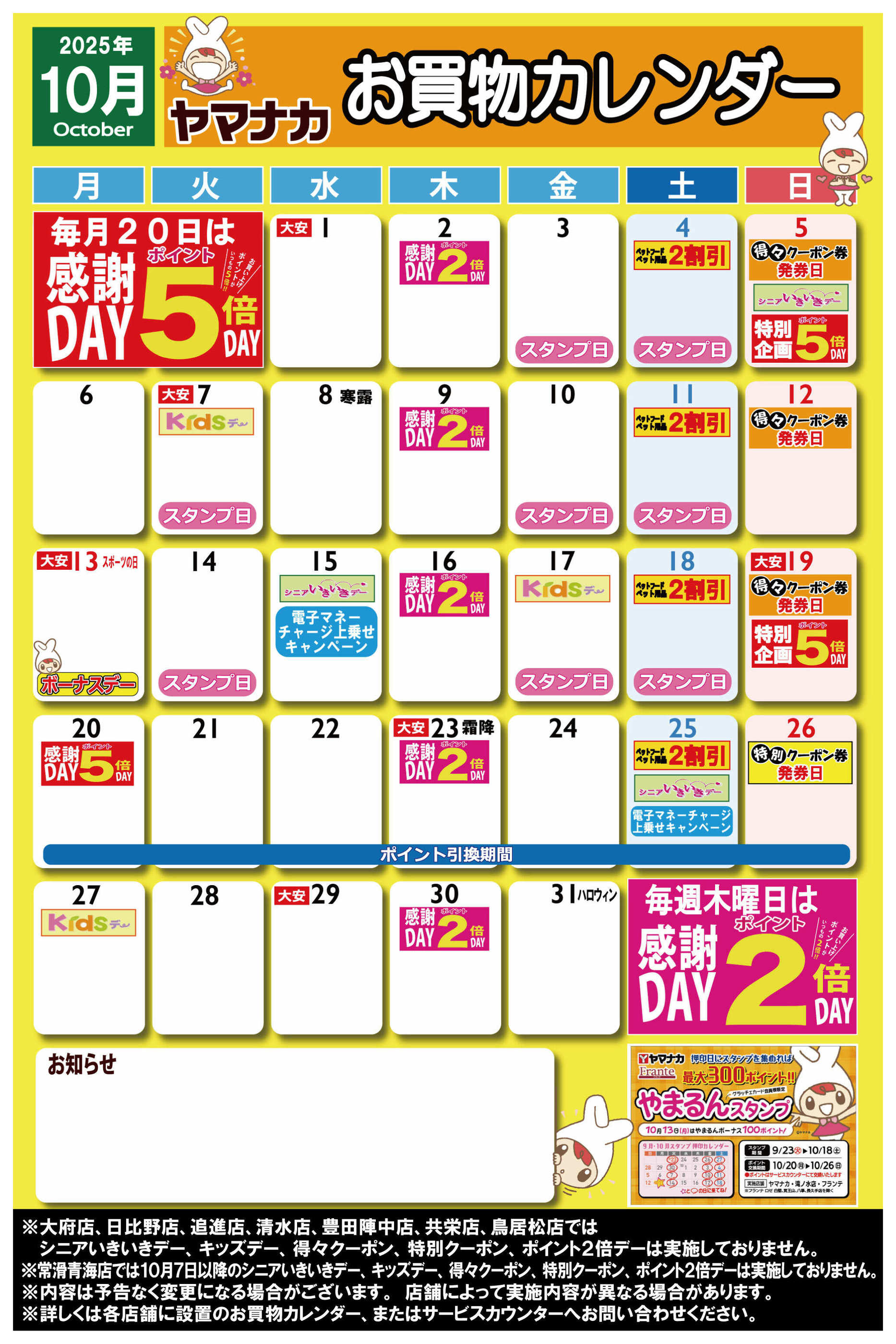 - 2025年9月26日〜10月31日まで【ヤマナカ版】10月お買物カレンダー (1枚)