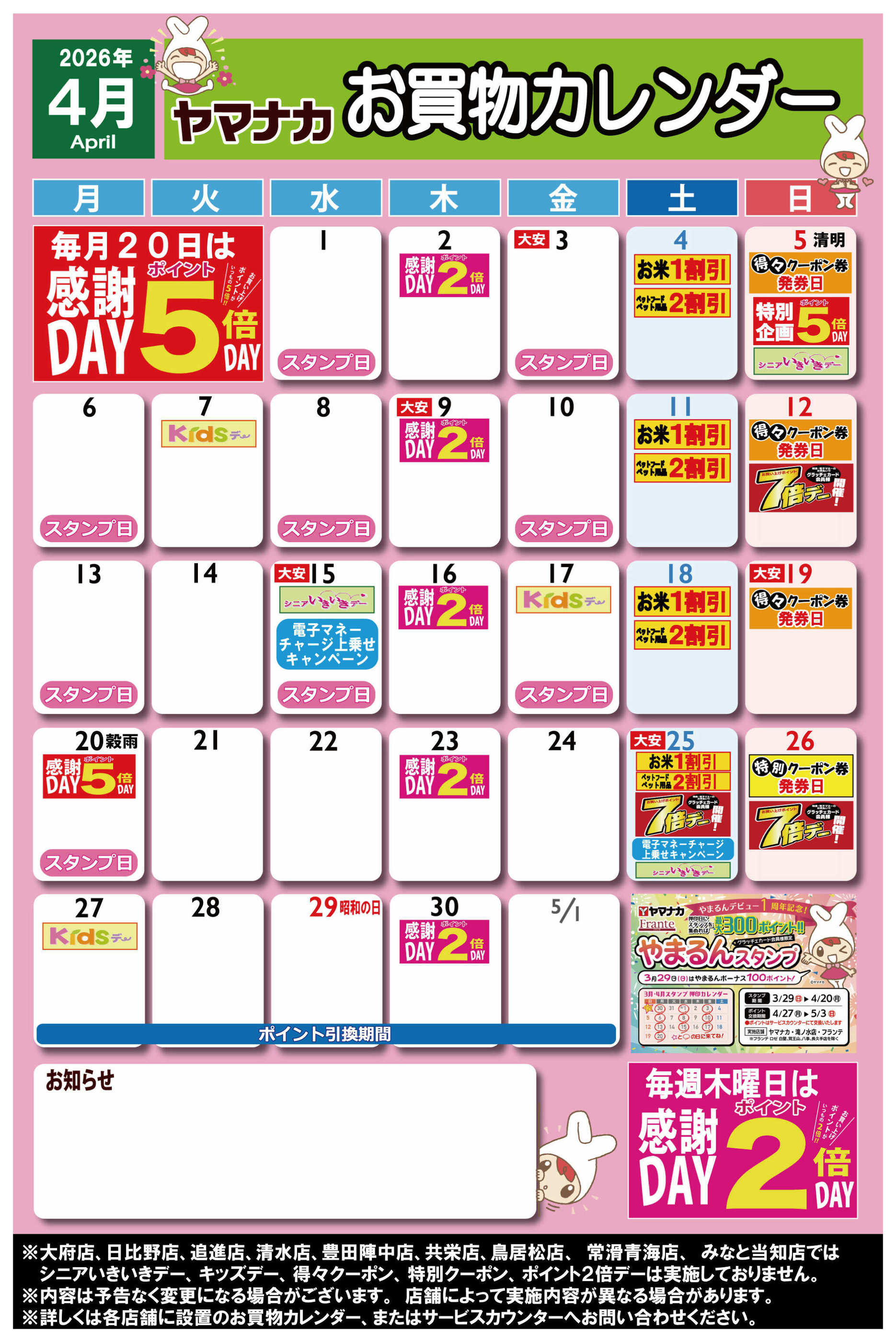 - 2026年3月28日〜4月30日まで【ヤマナカ版】4月お買物カレンダー (1枚)