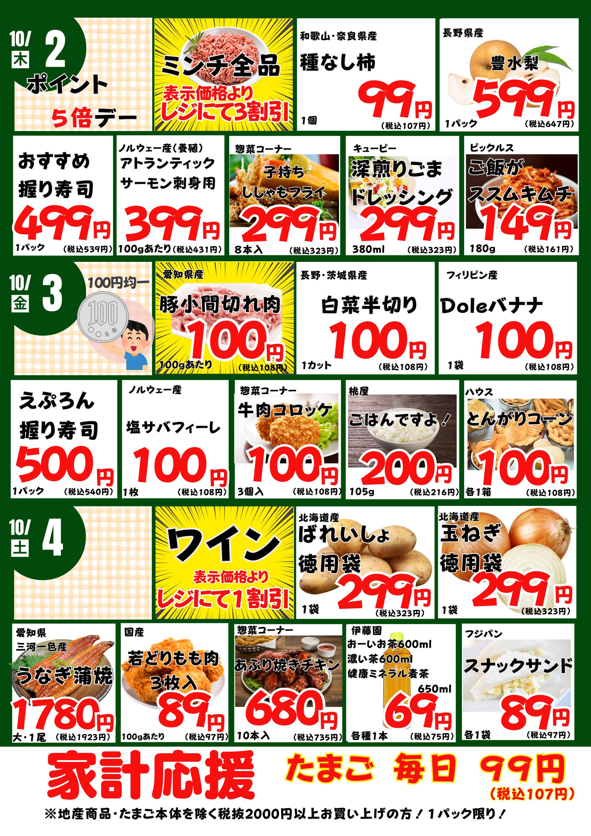 - (全店合同)10/6ポイント10倍デー実施! 2025年10月6日(2025-10-06) 〜 2025年10月6日(2025-10-06)・大林店、宮上店、生鮮館(浄水店)、生鮮館(リブレ元宮店)、藤岡店 (1枚)