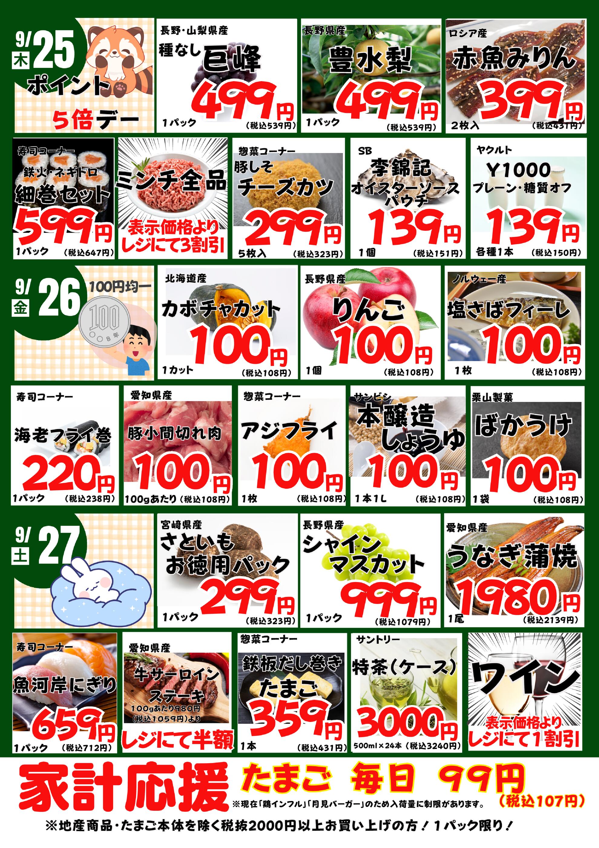 9/22~10/4 2週間お買い得「今!やすい値」 2025年9月22日(2025-09-22) 〜 2025年10月4日(2025-10-04)・全店、渋谷店、大林店、宮上店、生鮮館(浄水店)、生鮮館(リブレ元宮店)、藤岡店
