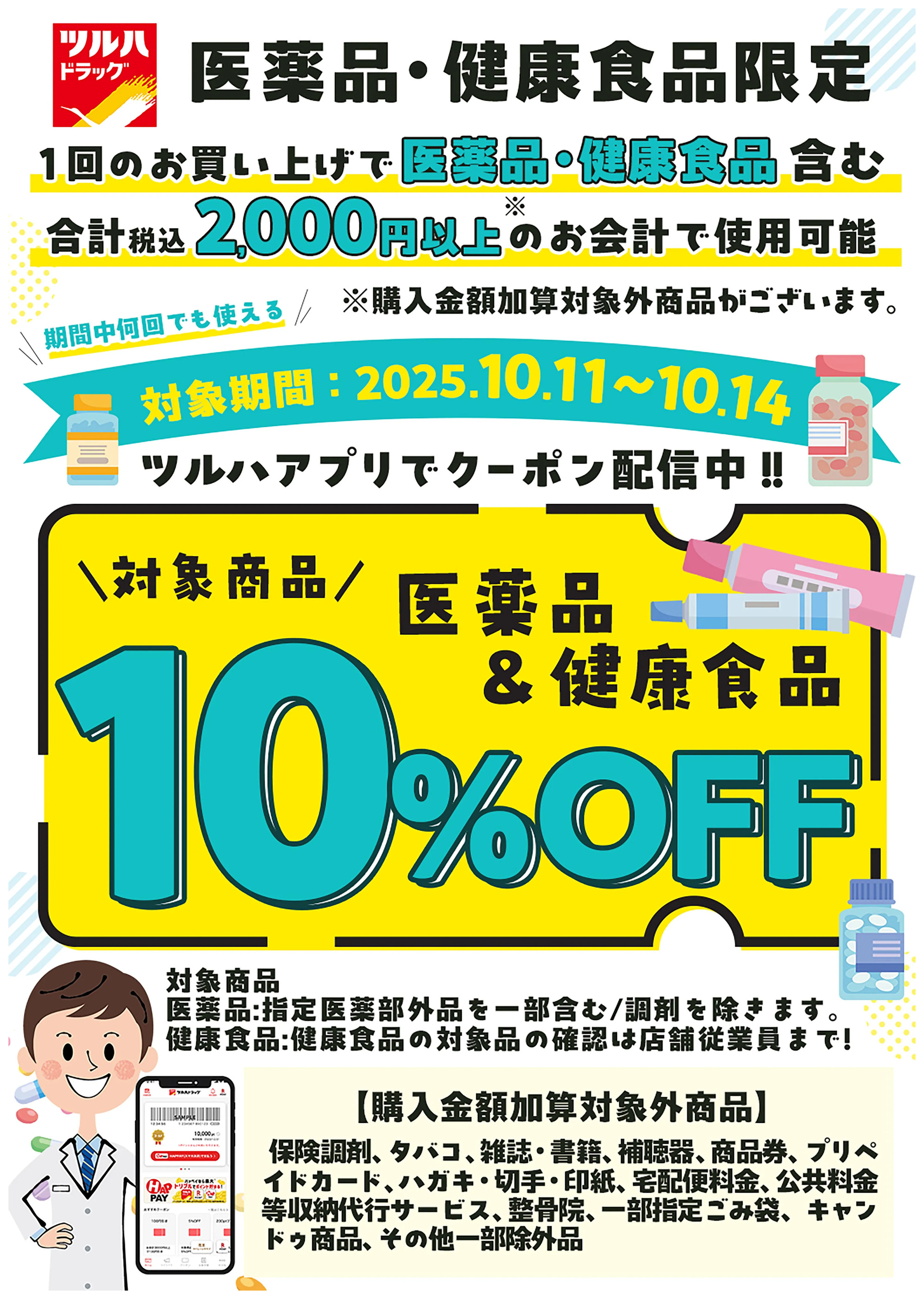 - 対象の医薬品・健康食品10%OFFクーポン!ツルハアプリで配信中!10月11日~10月14日 (1枚)