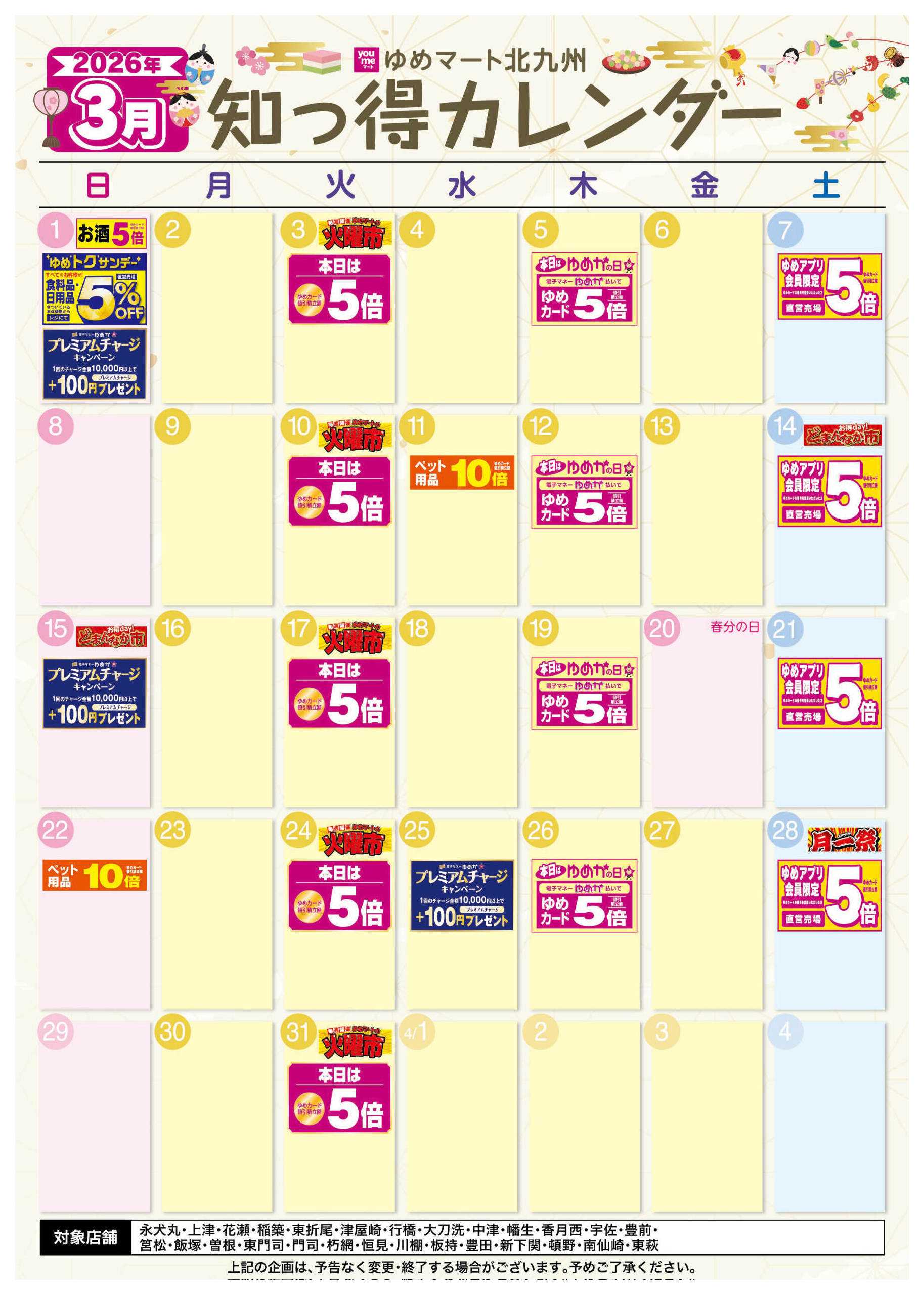 - 2026年2月27日〜3月31日まで3月 ゆめ知っ得カレンダー (1枚)