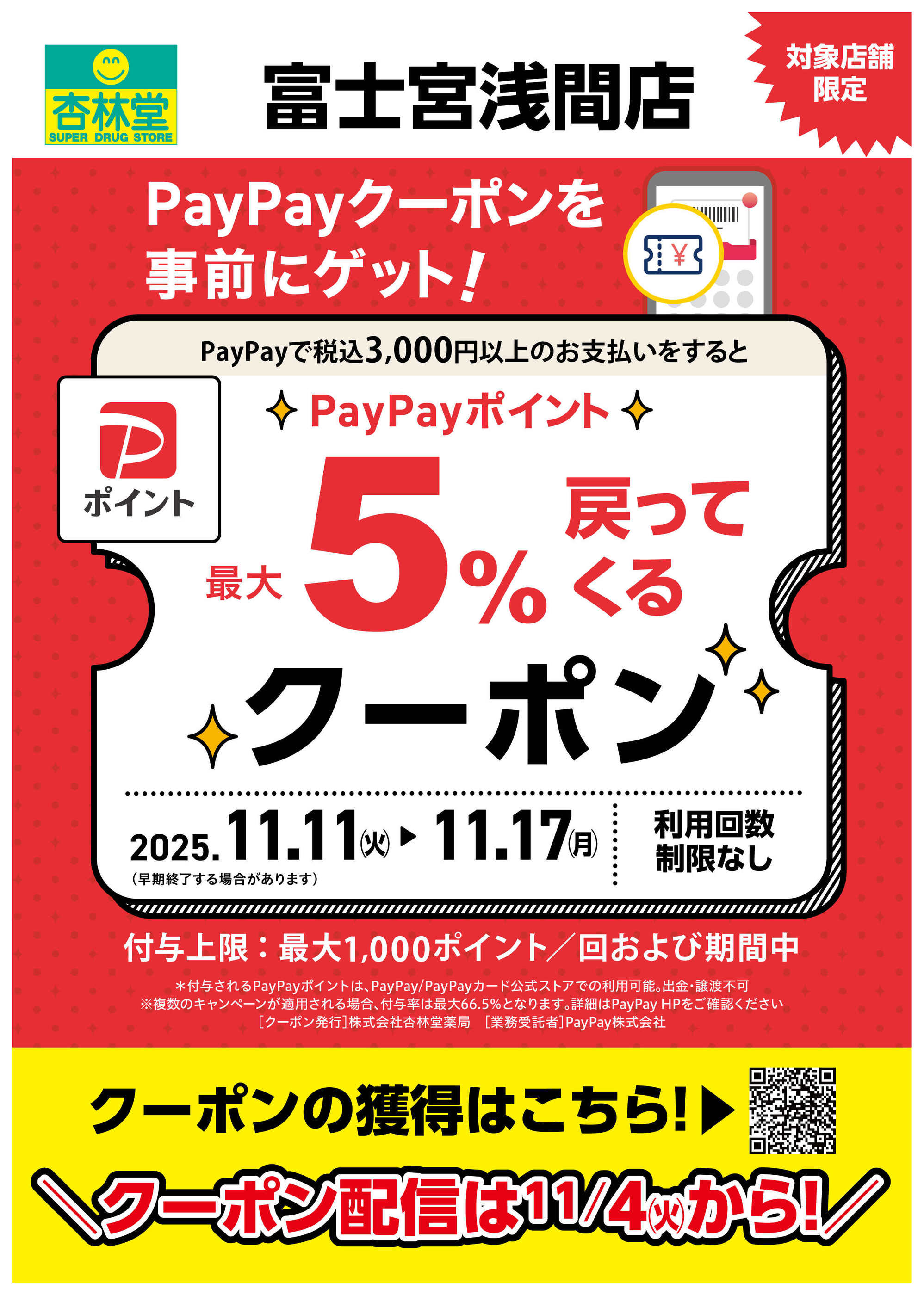 - 2025年11月4〜17日まで富士宮浅間店限定PayPayクーポン (1枚)