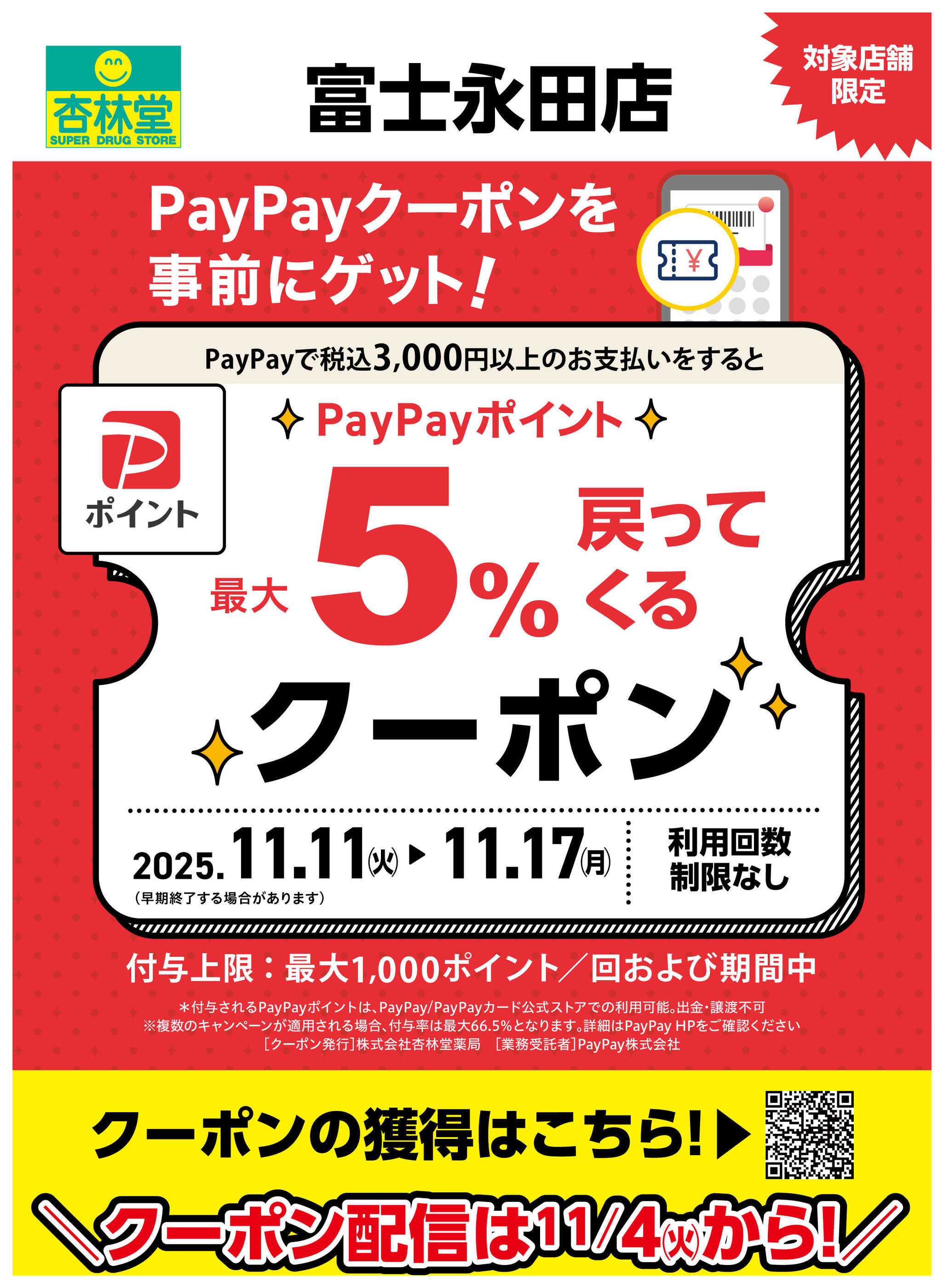 - 2025年11月4〜17日まで富士永田店限定PayPayクーポン (1枚)