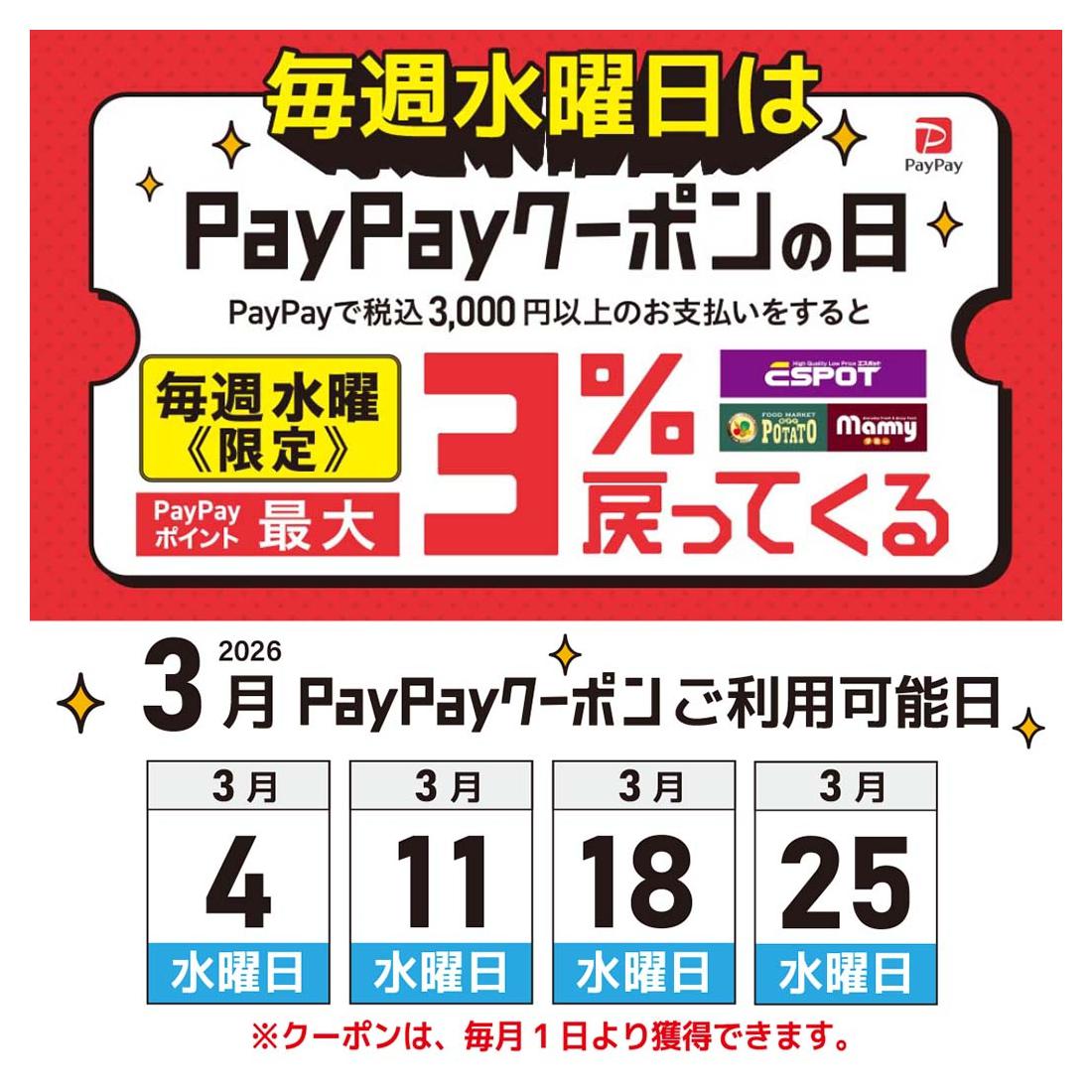 - 2026年3月2〜25日まで毎週水曜日はpaypayクーポンの日 (1枚)