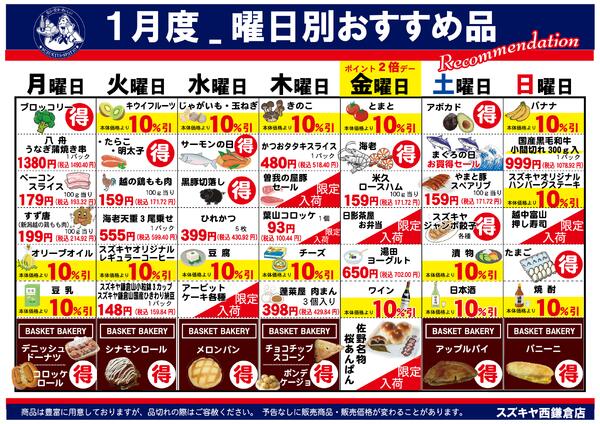 神奈川県鎌倉市西鎌倉1−20−50 スズキヤ西鎌倉店1月度曜日別おすすめ品2026/01/09 ~ 2026/01/31