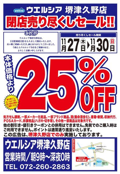 大阪府堺市西区津久野町1-26-27 11/27(木)~11/30(日) ウエルシア 堺津久野店 閉店売り尽くしセール!
