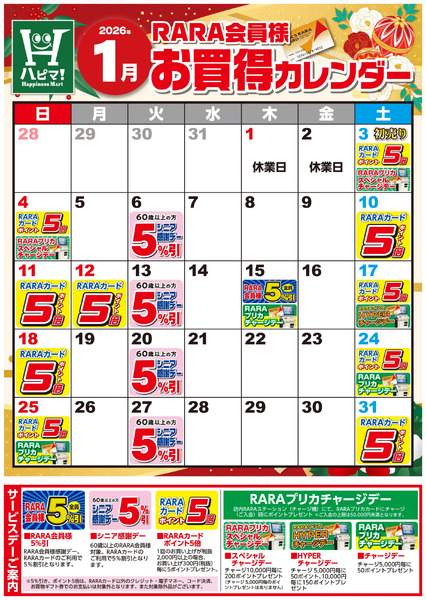 北海道釧路市春採6−2−4 【ハピネスマート春採店】RARA会員様1月お買得カレンダー1月1日~1月31日new
