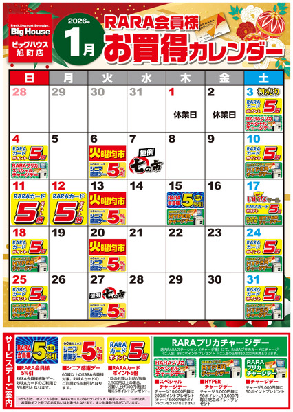 北海道釧路市川上町9−7 【ビッグハウス旭町店】RARA会員様1月お買得カレンダー1月1日~1月31日new